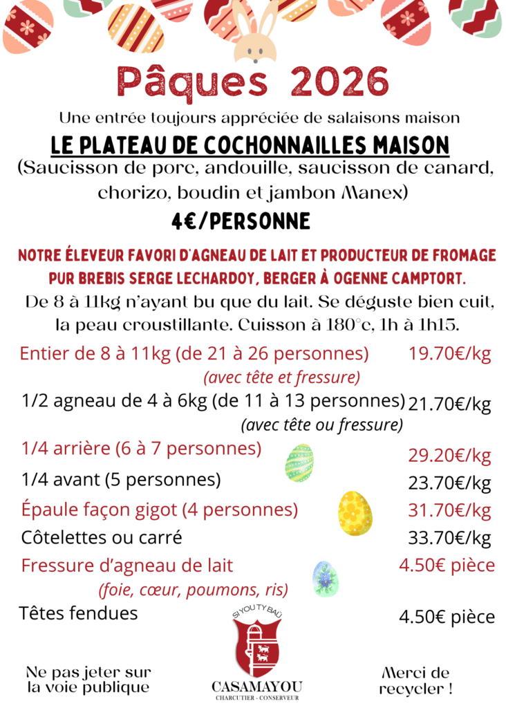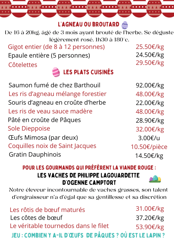 Les Fêtes de Pâques arrivent à grand pas, et afin de préparer au mieux votre repas de fête, nous vous laissons découvrir tout ce que nous proposons pour l’occasion ici :